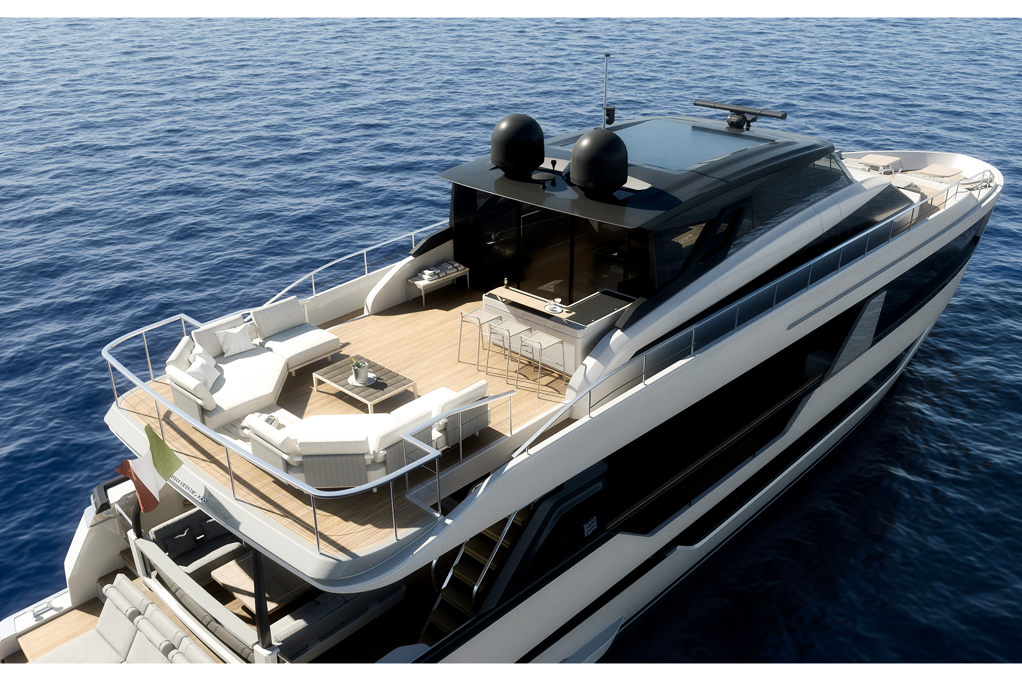 La terrazza esterna è accogliente e conviviale, con un bar in vetroresina e sgabelli, e l’area poppiera è personalizzabile con mobili autonomi, adattandosi ai gusti dell’armatore.