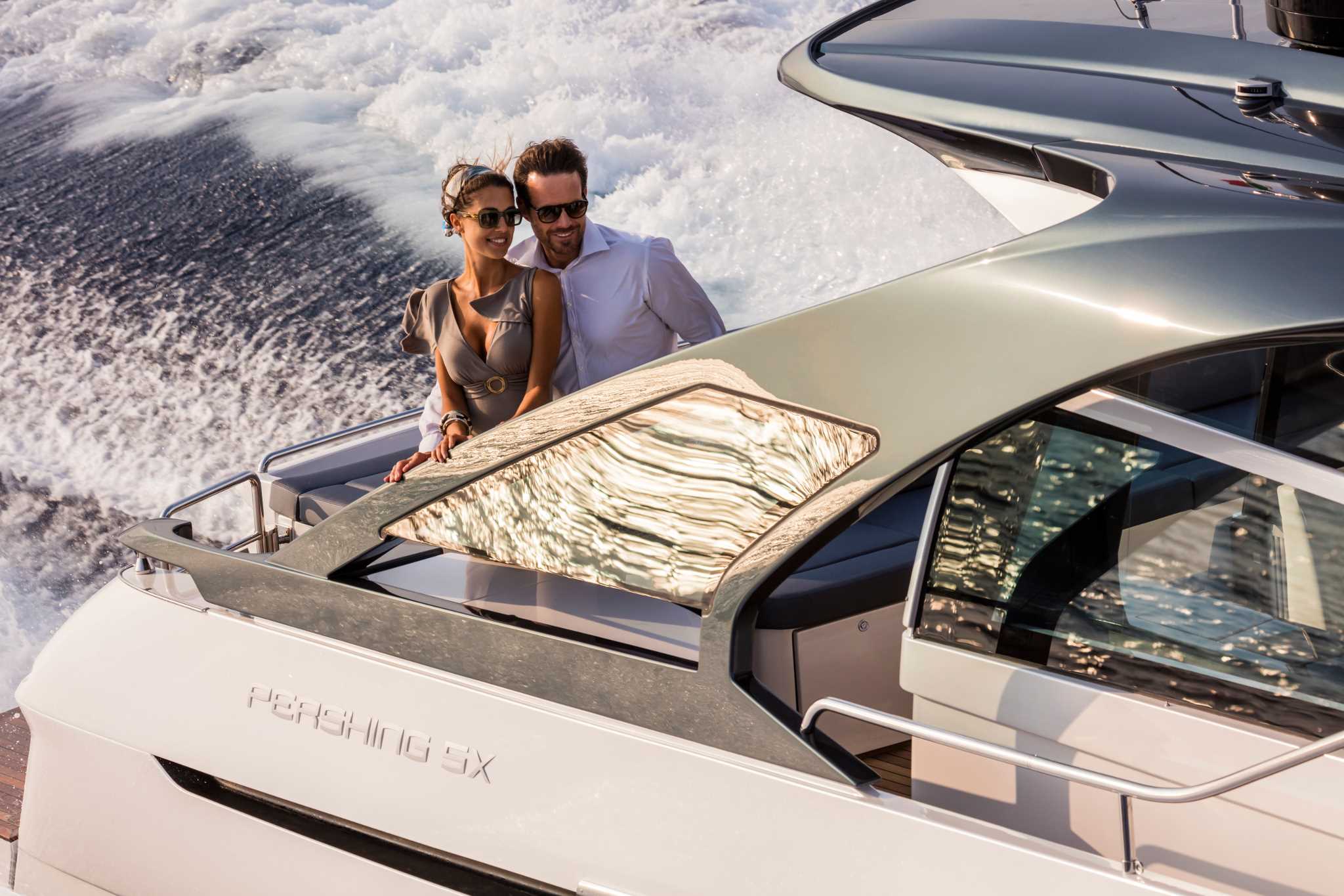 Le linee aerodinamiche assieme ai classici stilemi Pershing esaltano l’innovativo sistema di apertura e chiusura delle porte a cristallo e delle vetrate. Eleganza e potenza in un mix sensazionale.