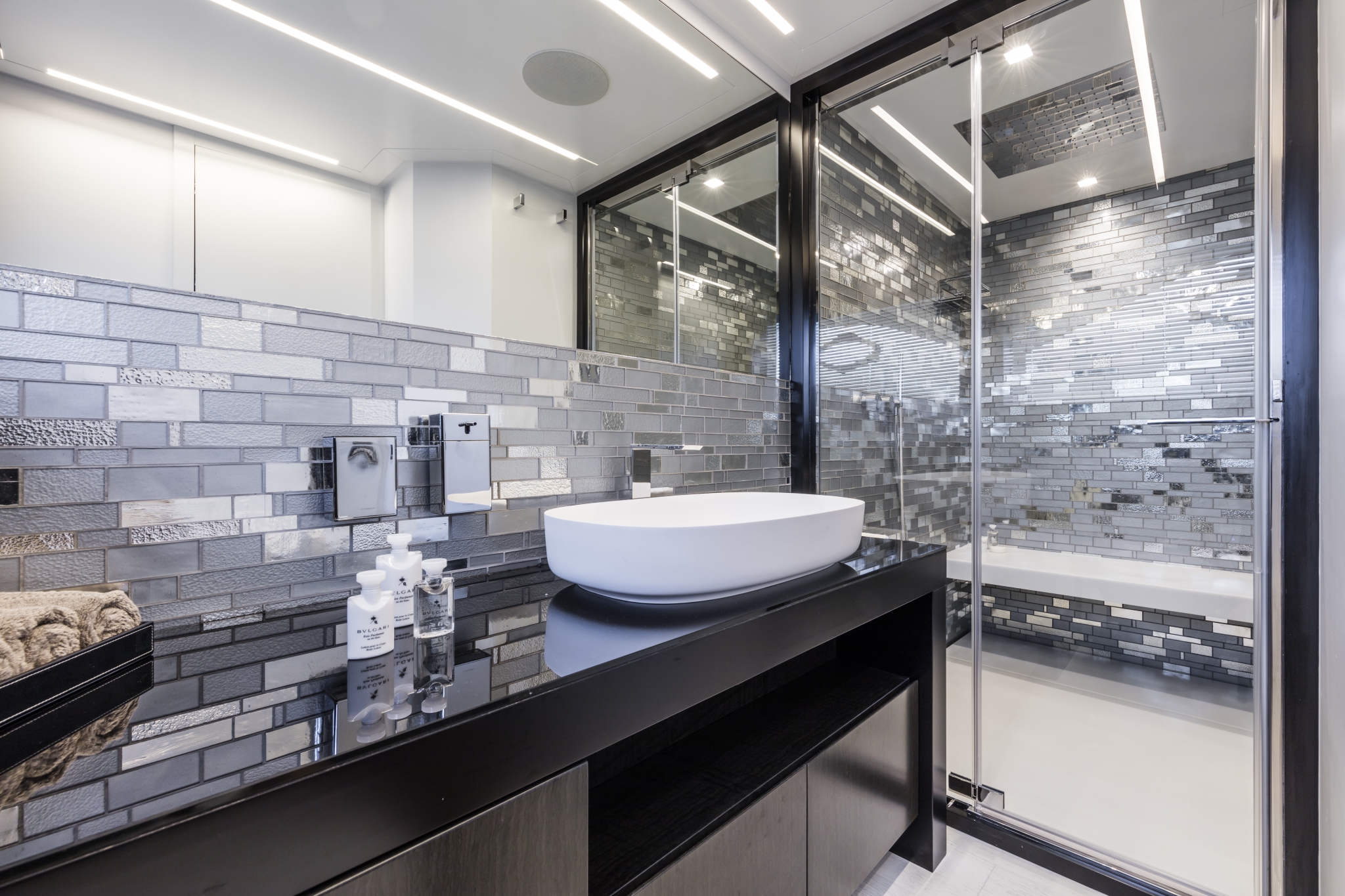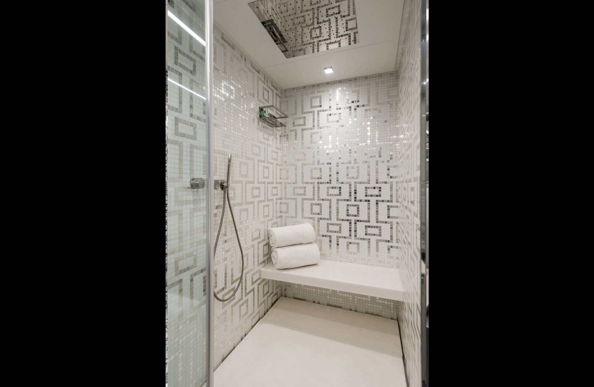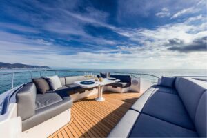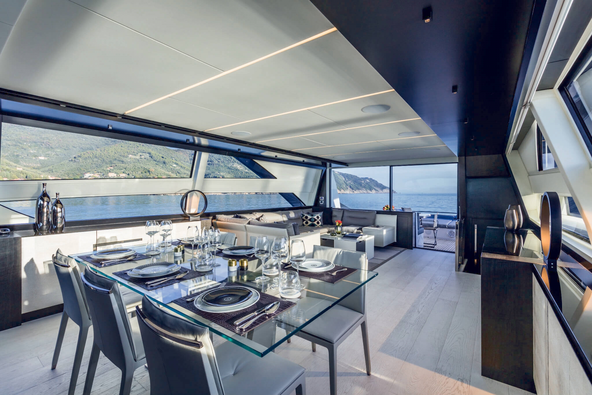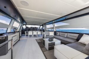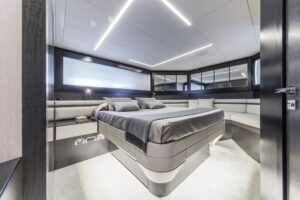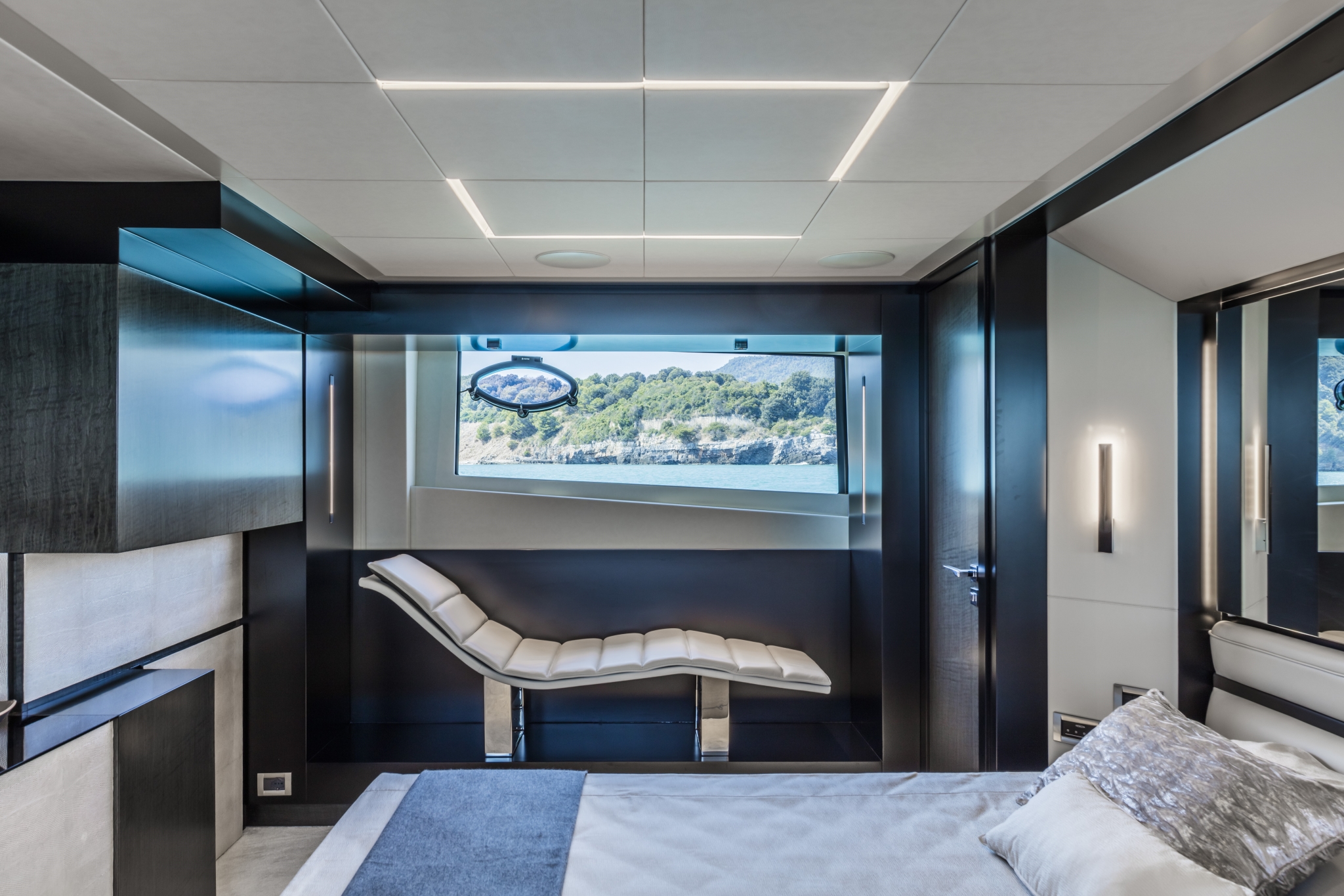Pershing 9X si adorna di interni dai colori freschi, con illuminazione adattata stilisticamente all’ambiente e spazi raffinati.