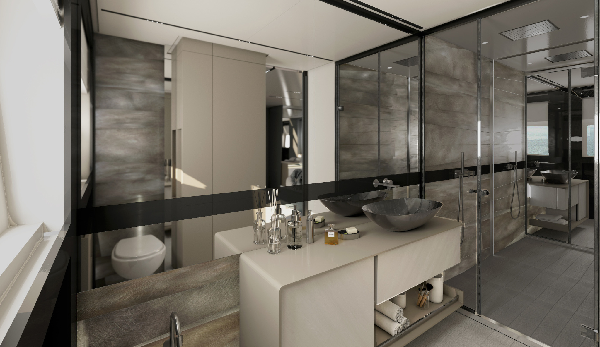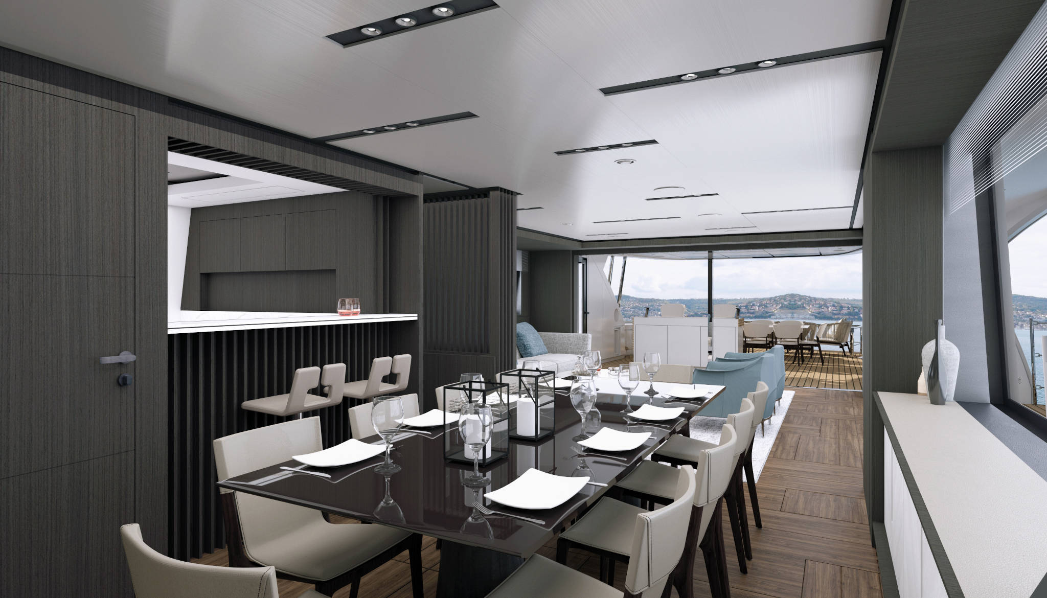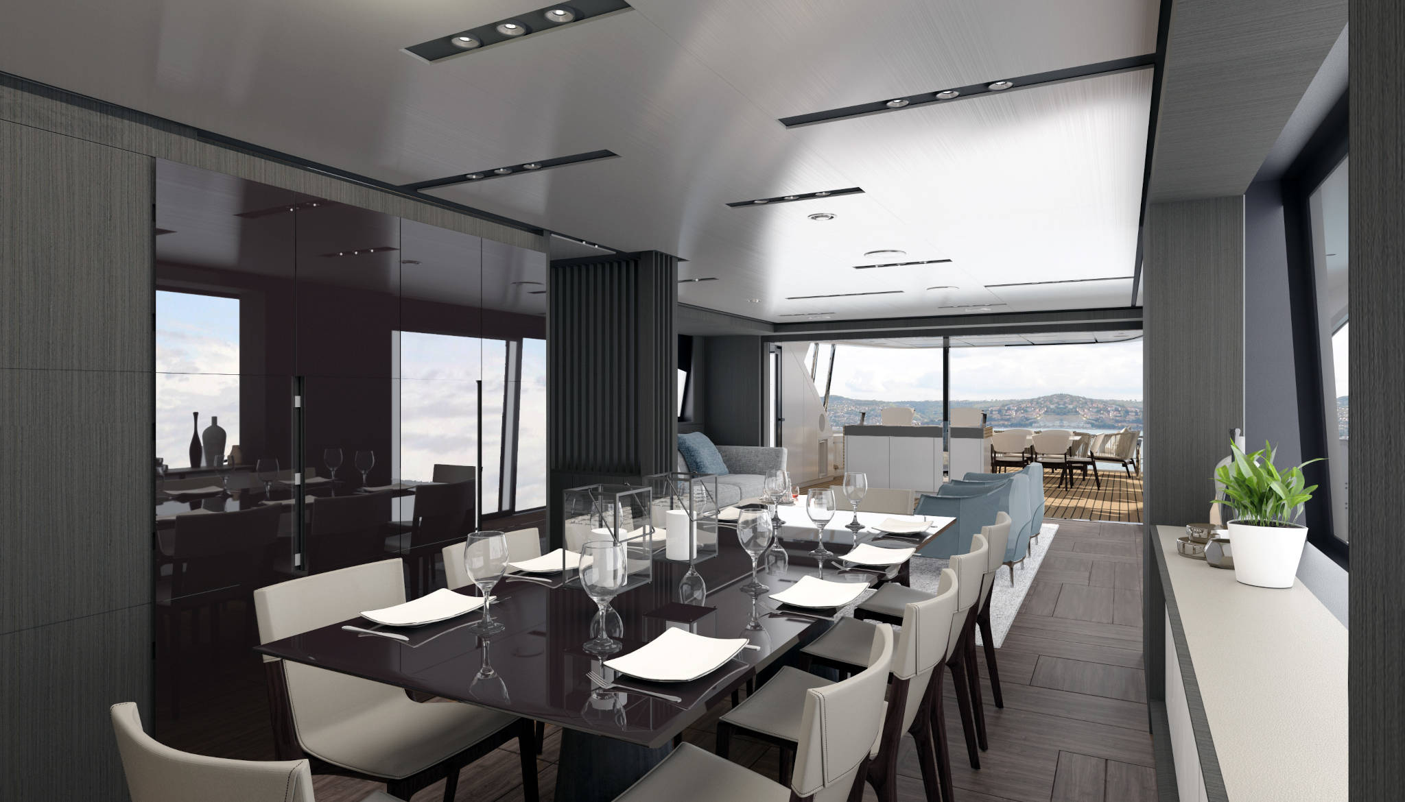 Spazi aperti, ampie finestrature e tecnologia abbattono tutte le barriere. Lo yacht diventa tutt’uno con ciò̀ che lo circonda.
